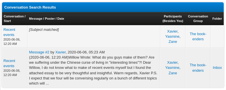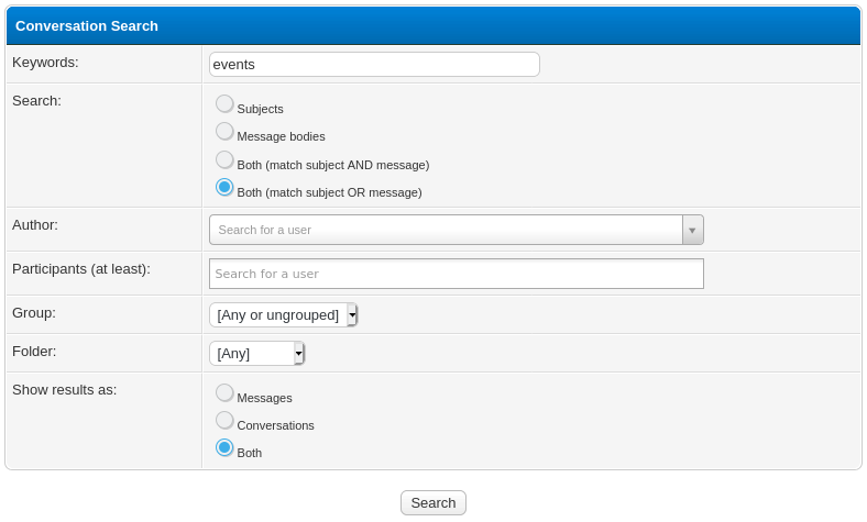 - Facilitates searching all conversation subjects and/or message bodies in conversations in which the member is involved.